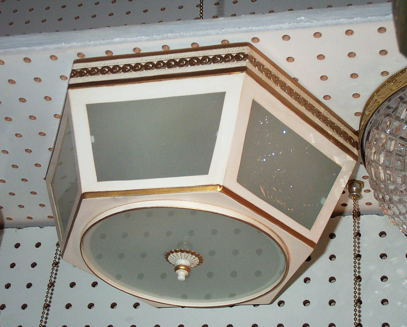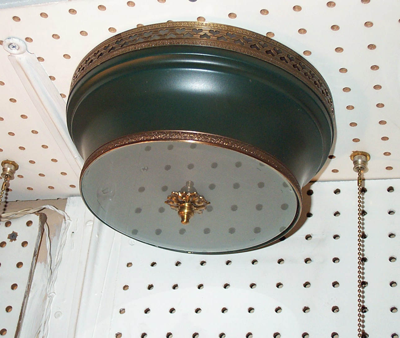 Semi-flush mounts with hanging crystal available up to 18"d. Various finishes available. Tole items available to size, custom painted or finished to order.